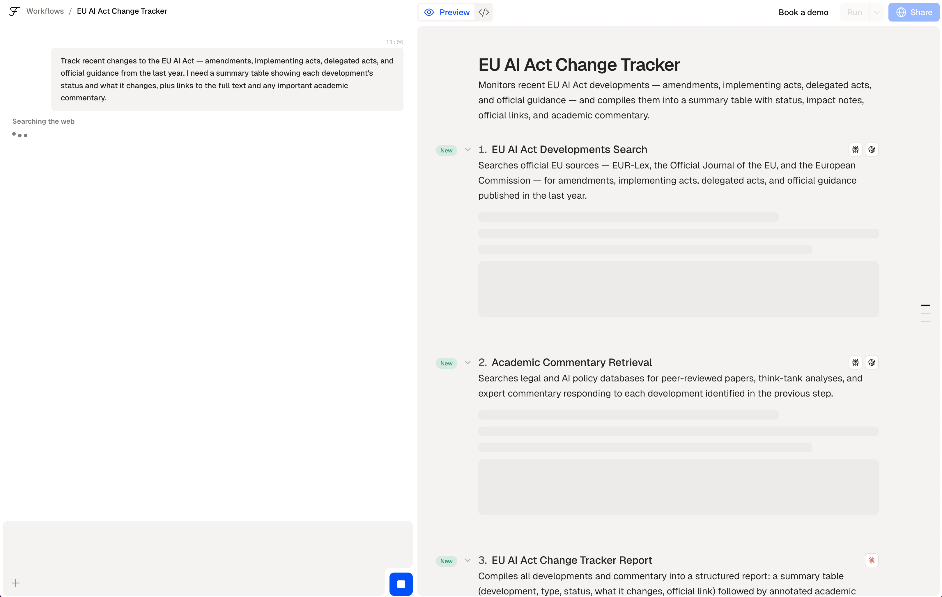 Click Run to execute your workflow. During a run you’ll see:- Each step processing in sequence