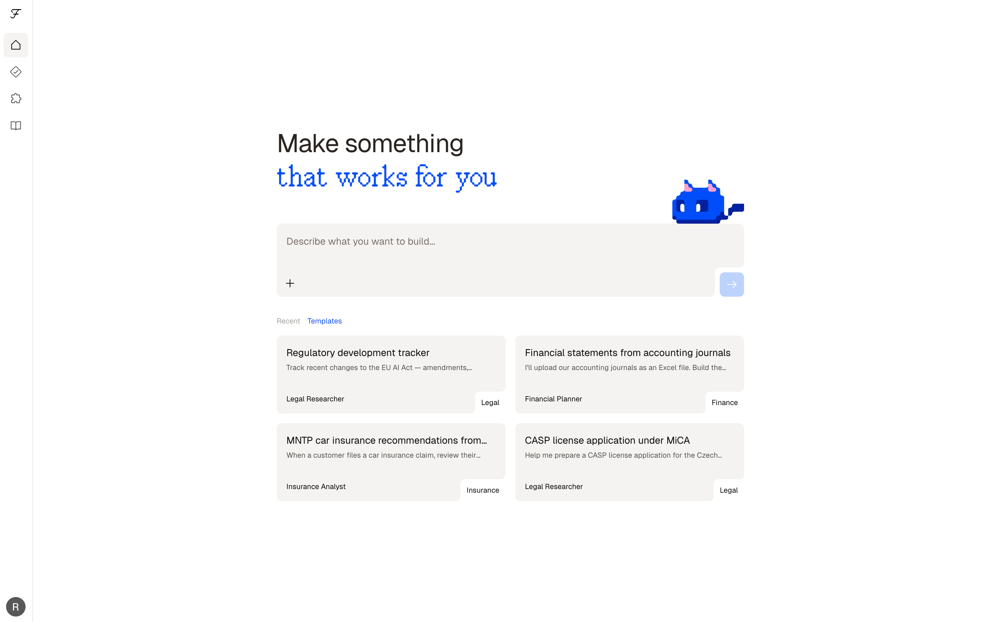 In the chat, continue the conversation — your homepage prompt is already the first message. Add detail, answer Felix’s questions, or refine the goal in plain language. Don’t worry about being precise — Felix will ask follow-up questions to fill in any gaps. A good first description explains:- What you’re working with (documents, data, emails, records)